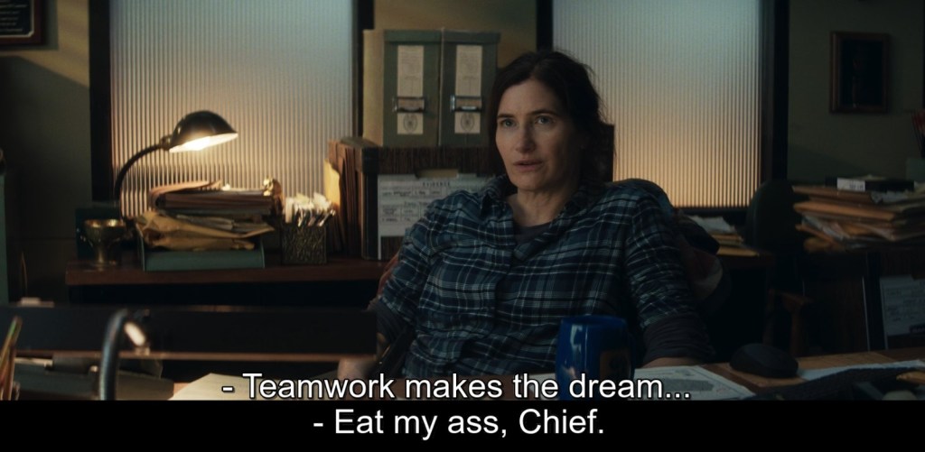 Ebbene, partiamo da qua. Da Agatha che è ancora Agnes intrappolata da tre anni nel suo incantesimo mentale, senza che la Strega Scarlatta possa tornare a infrangerlo, reiterandone o modificandone le sorti. Come era stato per WandaVision, anche stavolta, Westview viene imbellettata a favore del genere televisivo in cui è cristallizzata. Stiamo parlando di un livello da serie tv crime/drama – del tipo che True Detective e Mare of Easttown vengono insieme assemblate, sia per estetica che per linguaggio. Dentro questa realtà circoscritta, Kathryn Hahn vestirà i panni di una detective sola e scorbutica, prossima a scoprire la soluzione di un caso. È stato trovato un cadavere nel bosco. Capelli rossi, prime falangi delle dita macchiate di scuro. Non ha nome ed è una donna. Nell’obitorio avviene la realizzazione, una presa di coscienza che libererà Agatha e lascerà a noi il dubbio che Wanda Maximoff sia veramente morta in seguito alla caduta del Monte Wundagore (Doctor Strange in the Multiverse of Madness), distruggendo tutte le copie del Darkhold nel processo.
